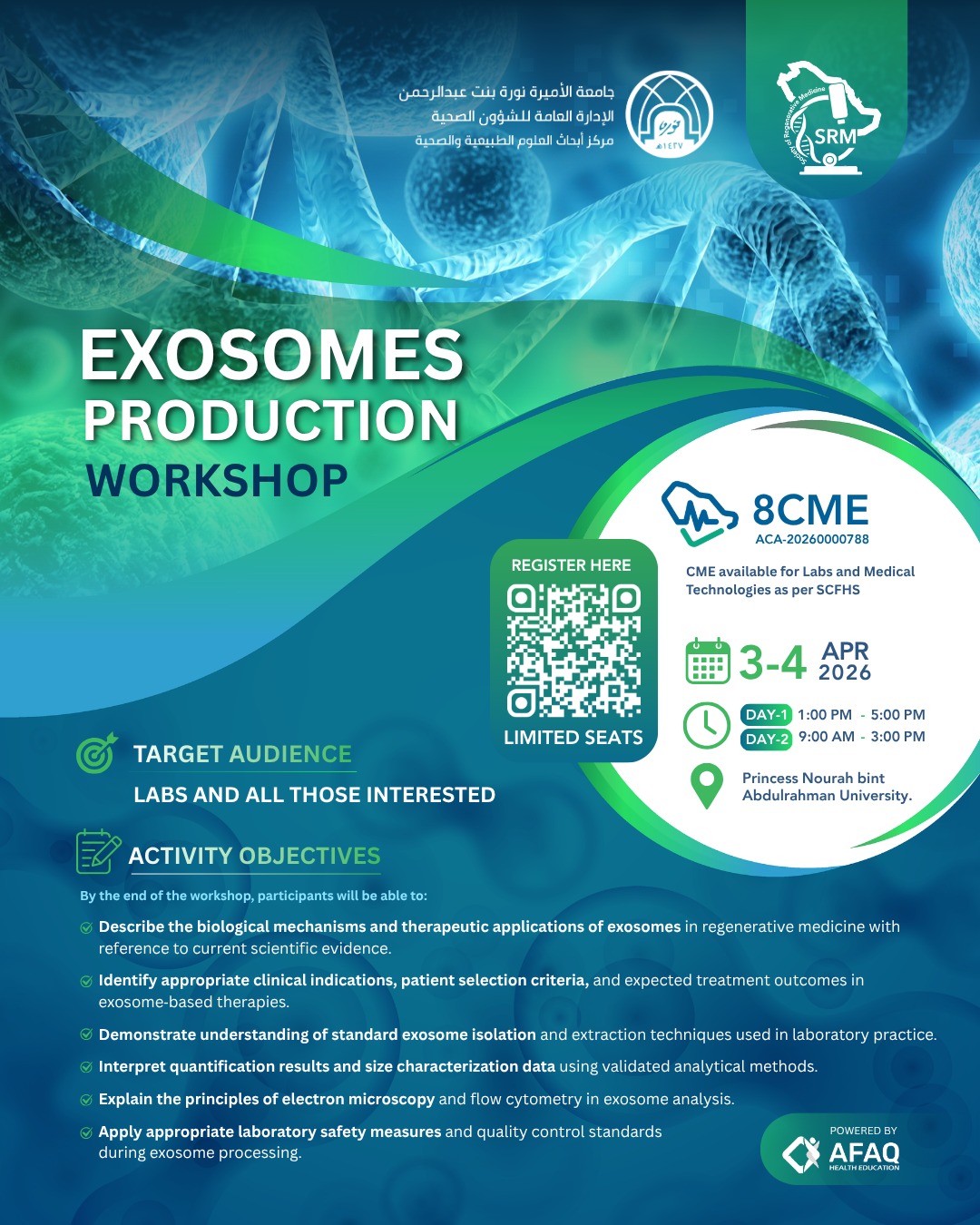 Join this CME-accredited workshop at Princess Nourah bint Abdulrahman University to gain hands-on expertise in exosome isolation, characterization, and therapeutic applications. Over two intensive days (April 3–4, 2026), participants will explore cutting-edge techniques—from electron microscopy to flow cytometry—while learning to apply safety, quality control, and evidence-based clinical criteria. Designed for lab professionals and anyone interested in regenerative medicine.